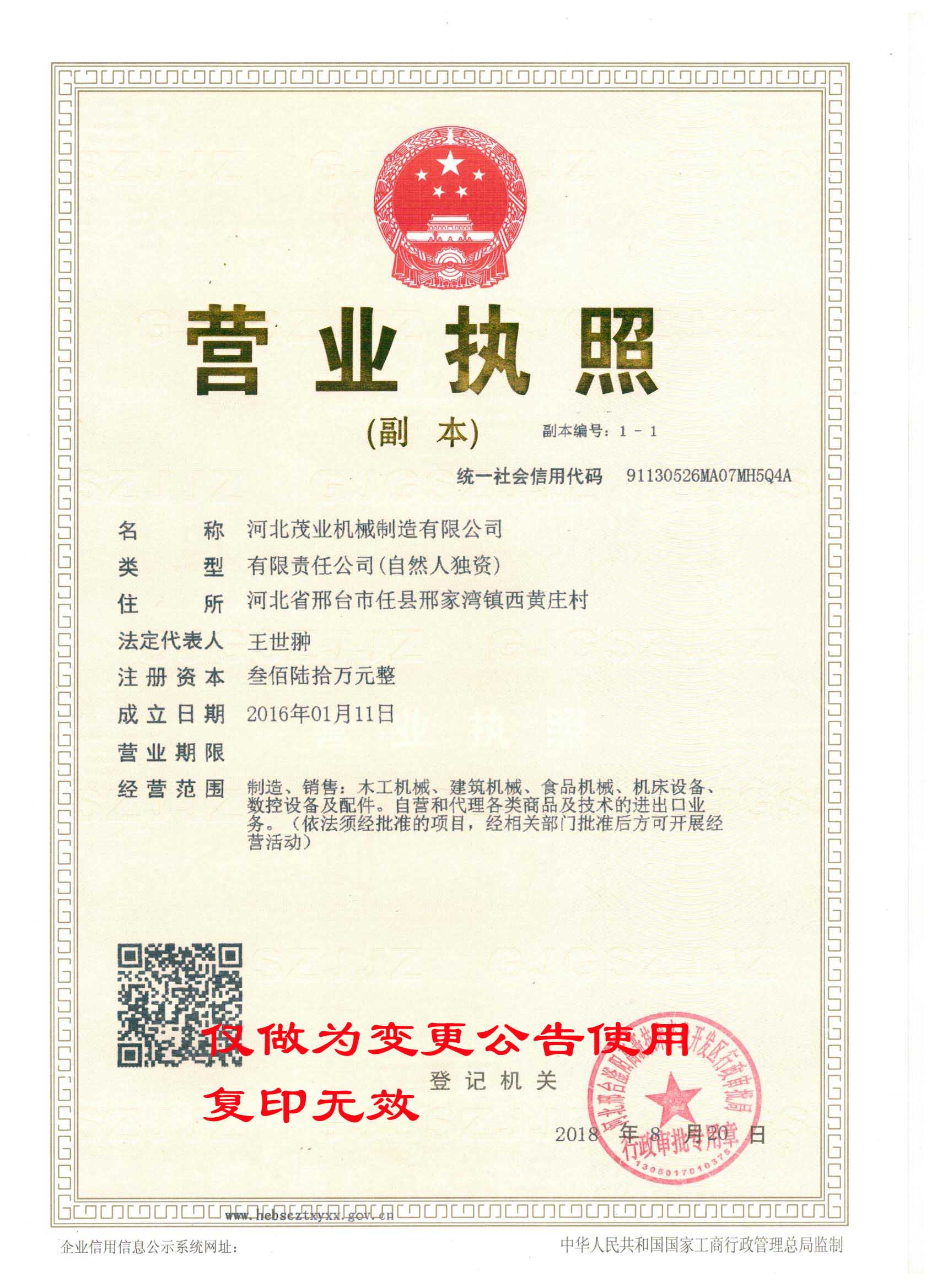 我司邢臺茂業(yè)機(jī)械制造有限公司,因公司業(yè)務(wù)發(fā)展的需要,現(xiàn)已整體變更為河北茂業(yè)機(jī)械制造有限公司,并于2018年8月20日取得河北邢臺滏陽高新技術(shù)產(chǎn)業(yè)開發(fā)區(qū)審批局頒發(fā)的營業(yè)執(zhí)照?,F(xiàn)將有關(guān)事項(xiàng)公告如下: